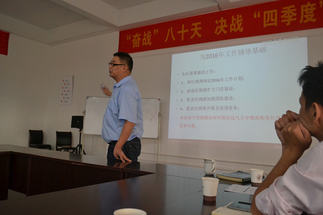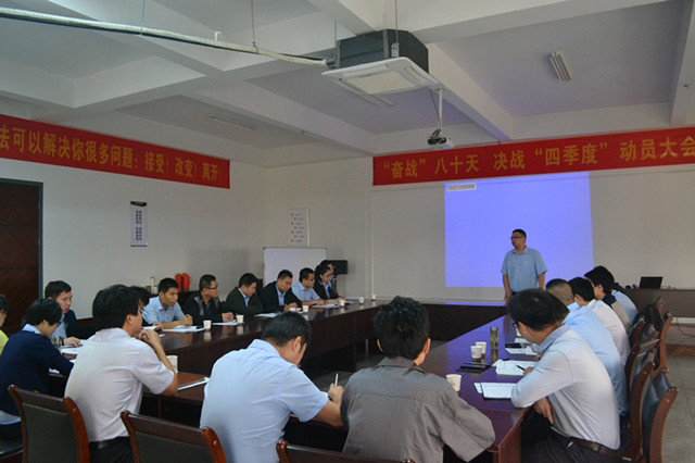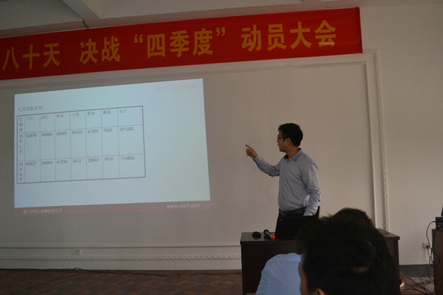 10月10日上午,奇力四樓會議室召開了 “奮戰(zhàn)80天,決戰(zhàn)四季度“動員大會。總經(jīng)理穆國強出席會議并指導(dǎo)工作,總經(jīng)辦副總經(jīng)理與營銷總監(jiān)率營銷部下屬銷售部、市場部全體人員及客服部代表參加會議。本次會議重點圍繞2015第三季度各項工作情況與問題進行全面匯總的同時,更對第四季度工作目標(biāo)做了詳細(xì)的規(guī)劃與布局。
