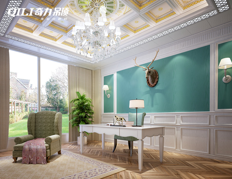 白色木紋墻裙與藍(lán)綠色墻面相呼應(yīng),難得一見的清麗脫俗。書房,就應(yīng)該有自己喜歡的情調(diào)。